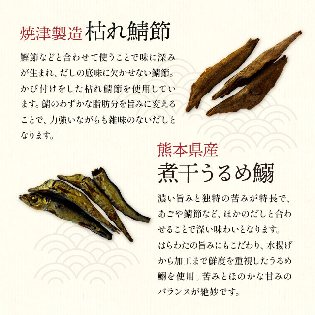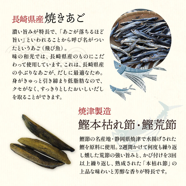 食塩(国内製造)、風味原料(鰹節粉末、鯖節粉末、煮干うるめ鰯粉末、飛魚粉末、昆布粒、椎茸粉末)、砂糖、鰹だし顆粒、粉末醤油、食用植物油脂/調味料(アミノ酸等)、乳酸カルシウム(一部に小麦・さば・大豆を含む) ※保存料、甘味料、着色料は使用しておりません |
