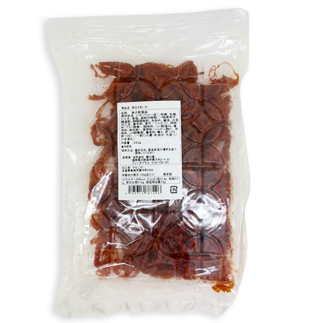 | 原材料 | いか(ペルー産)、砂糖、乳糖、たら子、食塩、澱粉分解物、一味唐辛子、醸造酢、発酵調味料、水あめ、醤油、大豆加工品、香辛料、寒天/ソルビット、調味料(アミノ酸等)、酸味料、リン酸塩Na、香辛料(添加物)、保存料(ソルビン酸K)、甘味料、pH調整剤、着色料(黄4、赤102、赤106)、(一部に小麦・乳成分・大豆・いかを含む) |